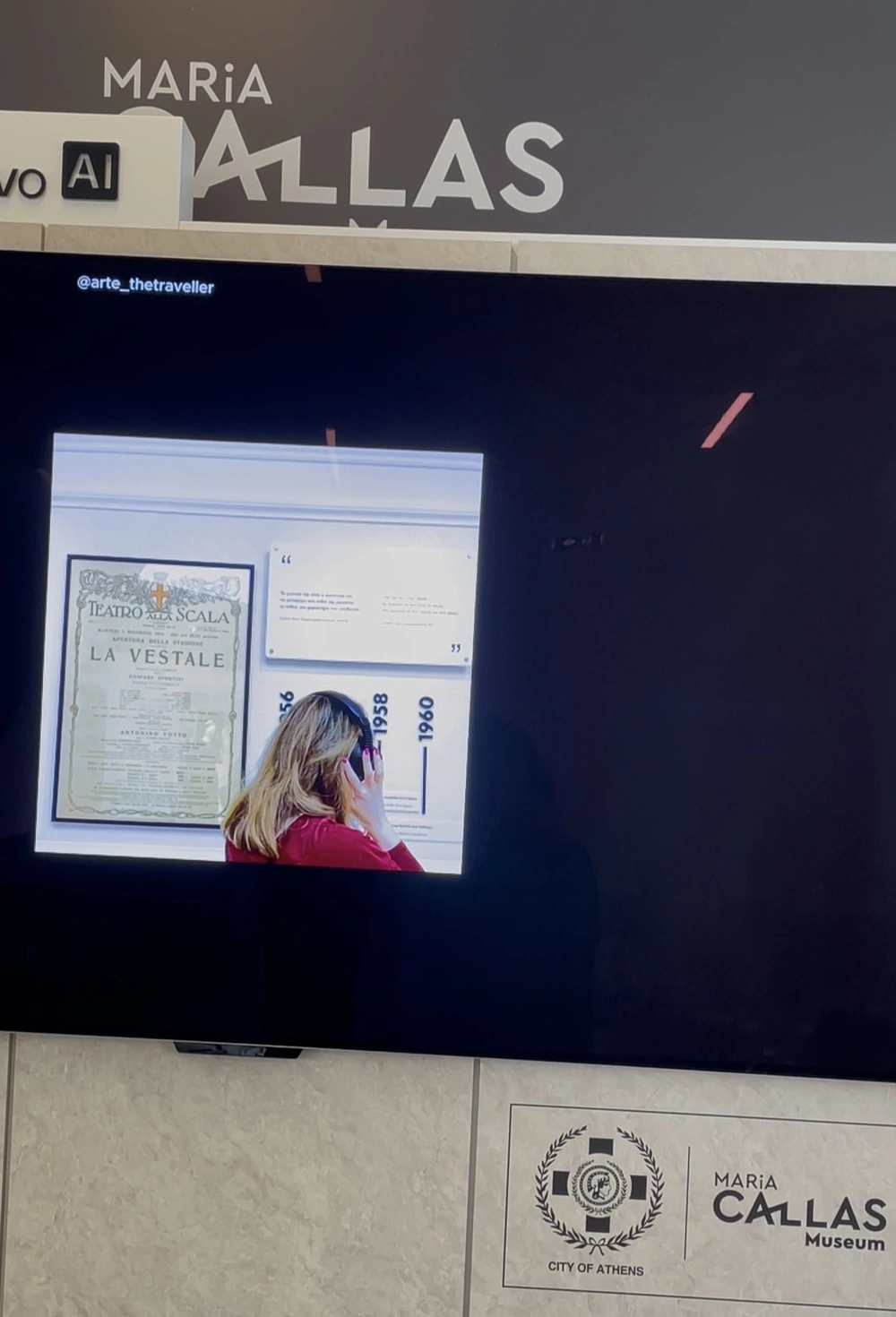 - Πάνω: Η Άρτεμις στην Pinacoteca di Brera στο Μιλάνο, ένα από τα σημαντικότερα μουσεία της Ευρώπης, όπου εργάστηκε στο Τμήμα Επικοινωνίας. Δεξιά: Στο πλαίσιο της Διεθνούς Ημέρας Μουσείων 2025, προβλήθηκε στον χώρο εκδηλώσεων του Μουσείου Μαρία Κάλλας βίντεο από τη σελίδα της στο Instagram @arte_thetraveller