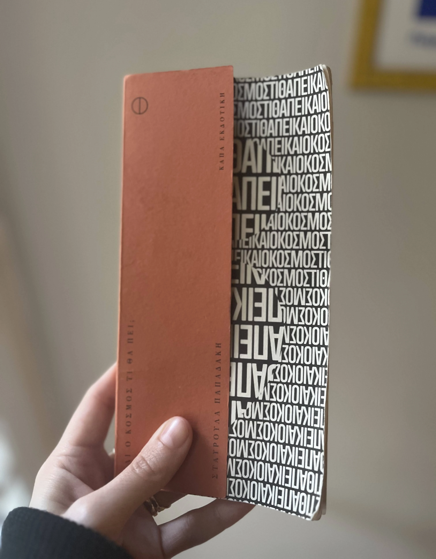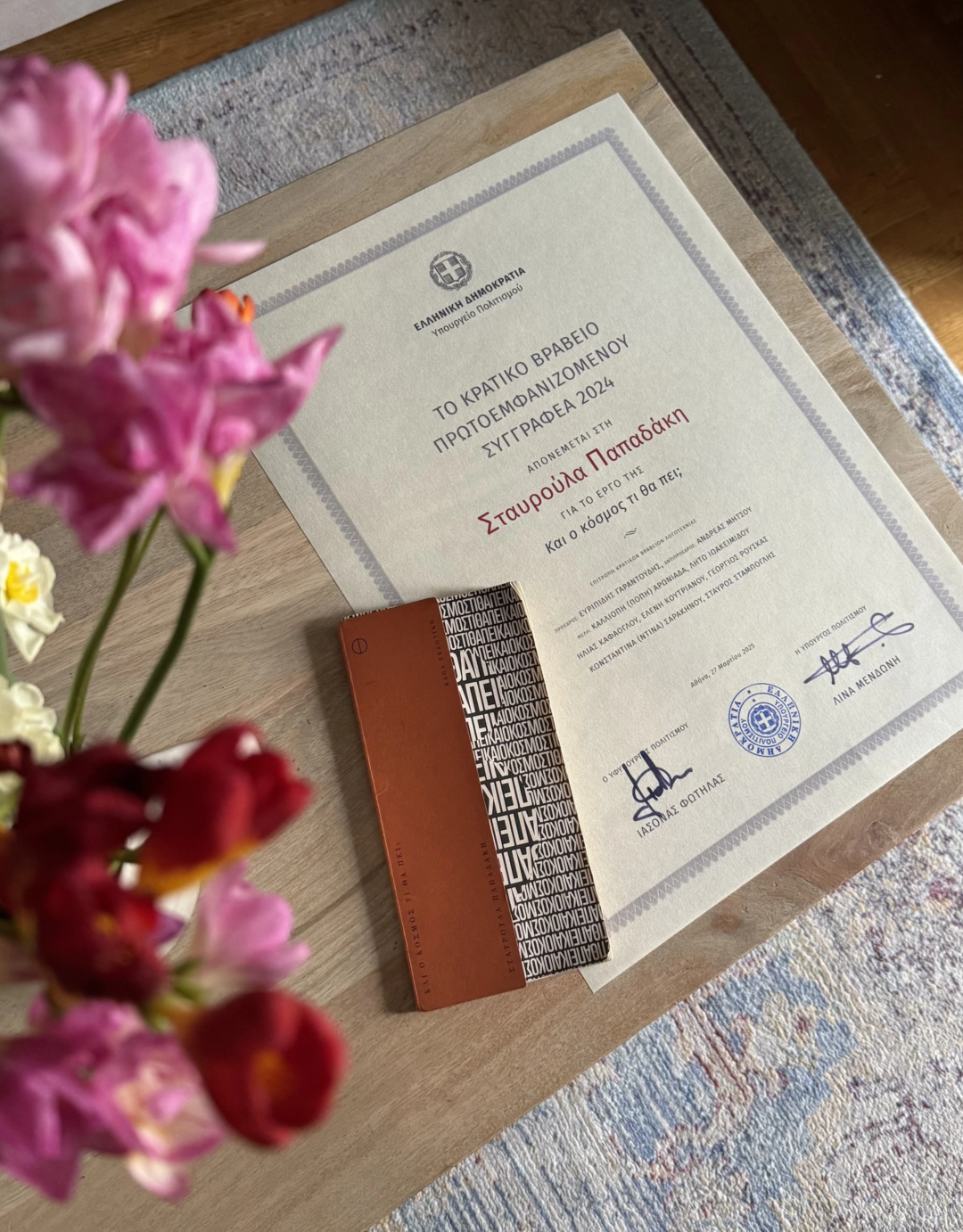 - “Και ο κόσμος τι θα πει;” Το εξώφυλλο της ποιητικής συλλογής της Σταυρούλας Παπαδάκη, οι σκέψεις της ποιήτριας στην πρώτη σελίδα και το Κρατικό Βραβείο πρωτοεμφανιζόμενου συγγραφέα 2024.